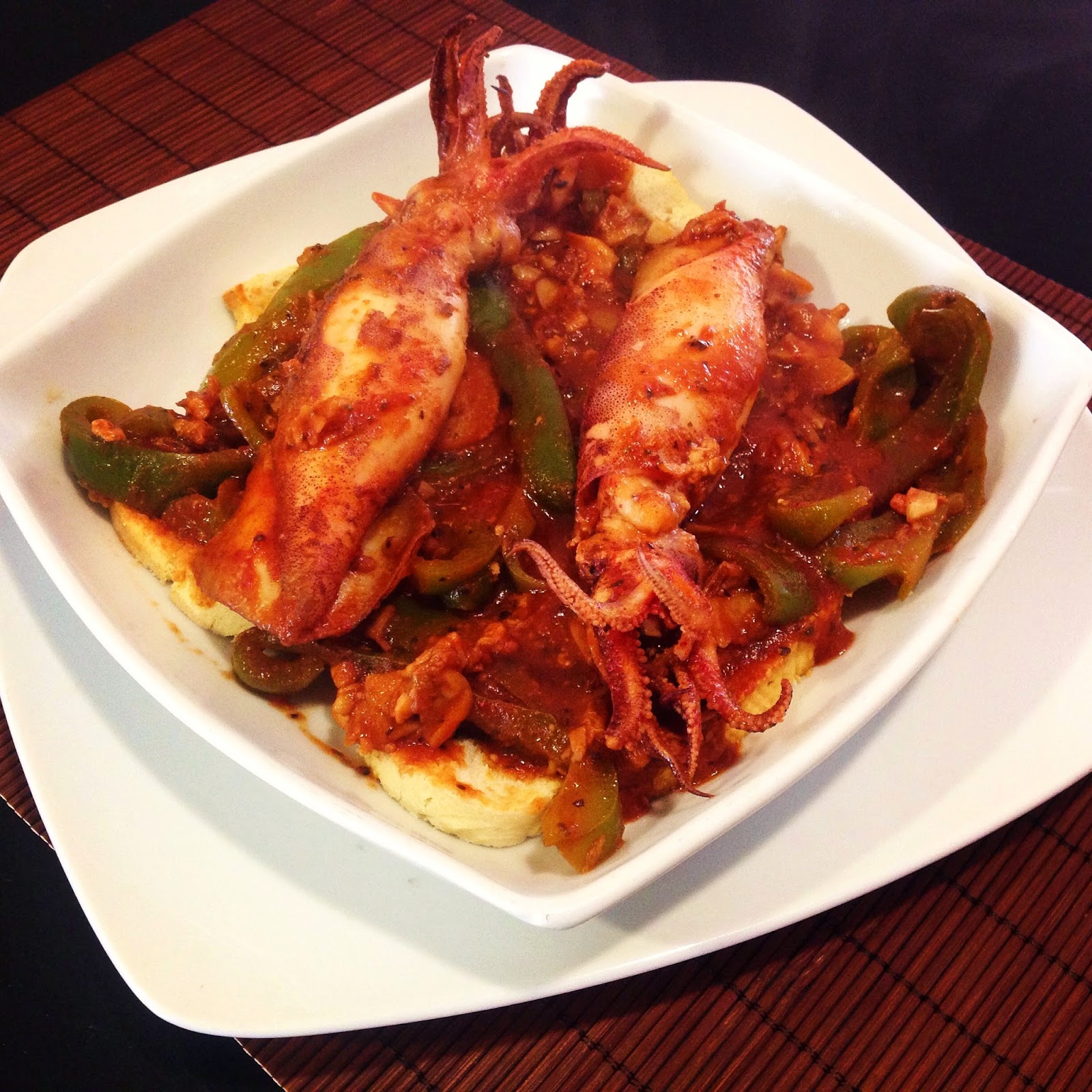 Lulas com Molho de Tomate e Pimentos em Cama de Tosta Integral